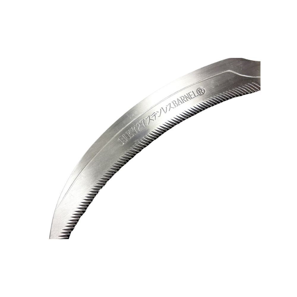 A heavy duty gauge stainless steel Saw with a serrated edge blade with a Wood Handle.